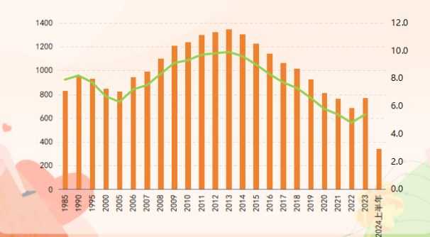 2024年前三季度的全国结婚登记数为474.7万对,同比去年减少了94.3万对。2024年上半年的出生人口仅为433万,联合国预测中国2024年的总出生人口将为882万,又是一个历史新低。这些数据表明,又越来越多的人选择了“不婚”与“丁克”这种生活方式,这必将会引起一系列连锁反应。结婚率、生育率以及传统的婚恋观,都将会受到冲击。